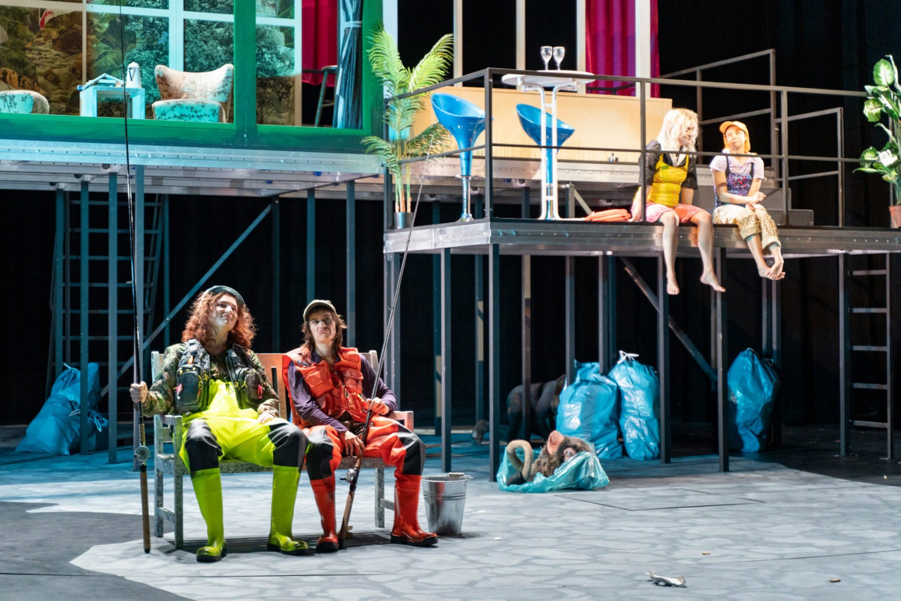 Beachtlich ist die Verwandlungsfähigkeit aller Schauspieler*innen. Viele der zehn Schauspieler*innen schlüpfen in mehrere Rollen, manche gar in fünf verschiedene: Izabella Radić ist Servicekraft, überlegene Klientin eines schwachen Therapeuten, erfolgreiche Managerin sowie Fisch und Taube: Man nimmt ihr jede Rolle ab. Auch bei Carolin Weber habe ich das wieder erlebt: Ich saß da und dachte kurz, das könne nicht Carolin Weber sein — und doch war sie es. Besonders die Szene mit der Nachbarin, die durchs Fenster schaut, war so echt, wie man es in jedem Dorf und jeder Stadt beobachten kann.